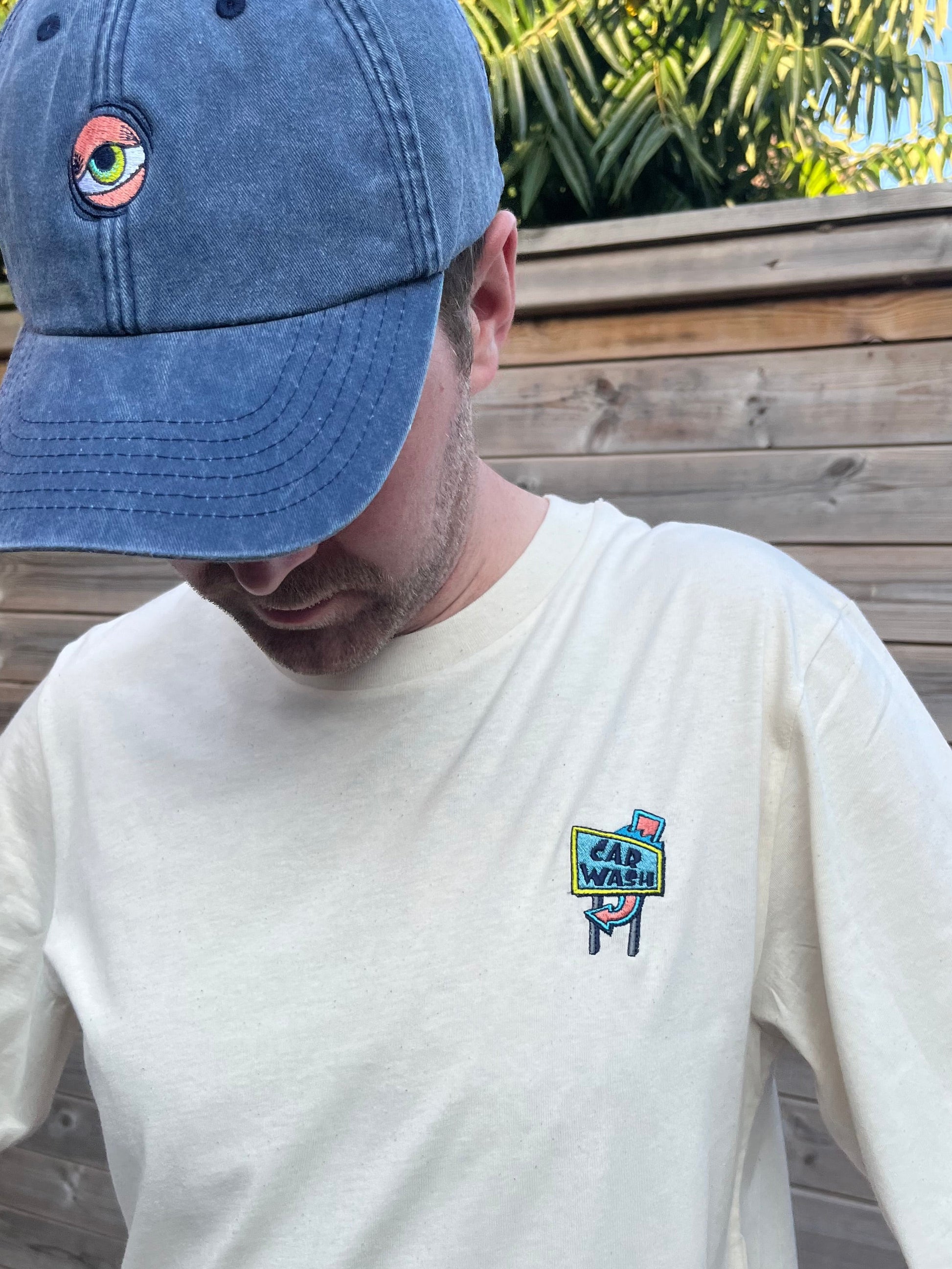 - Embroidered Retro Car Wash Sign on the front pocket!