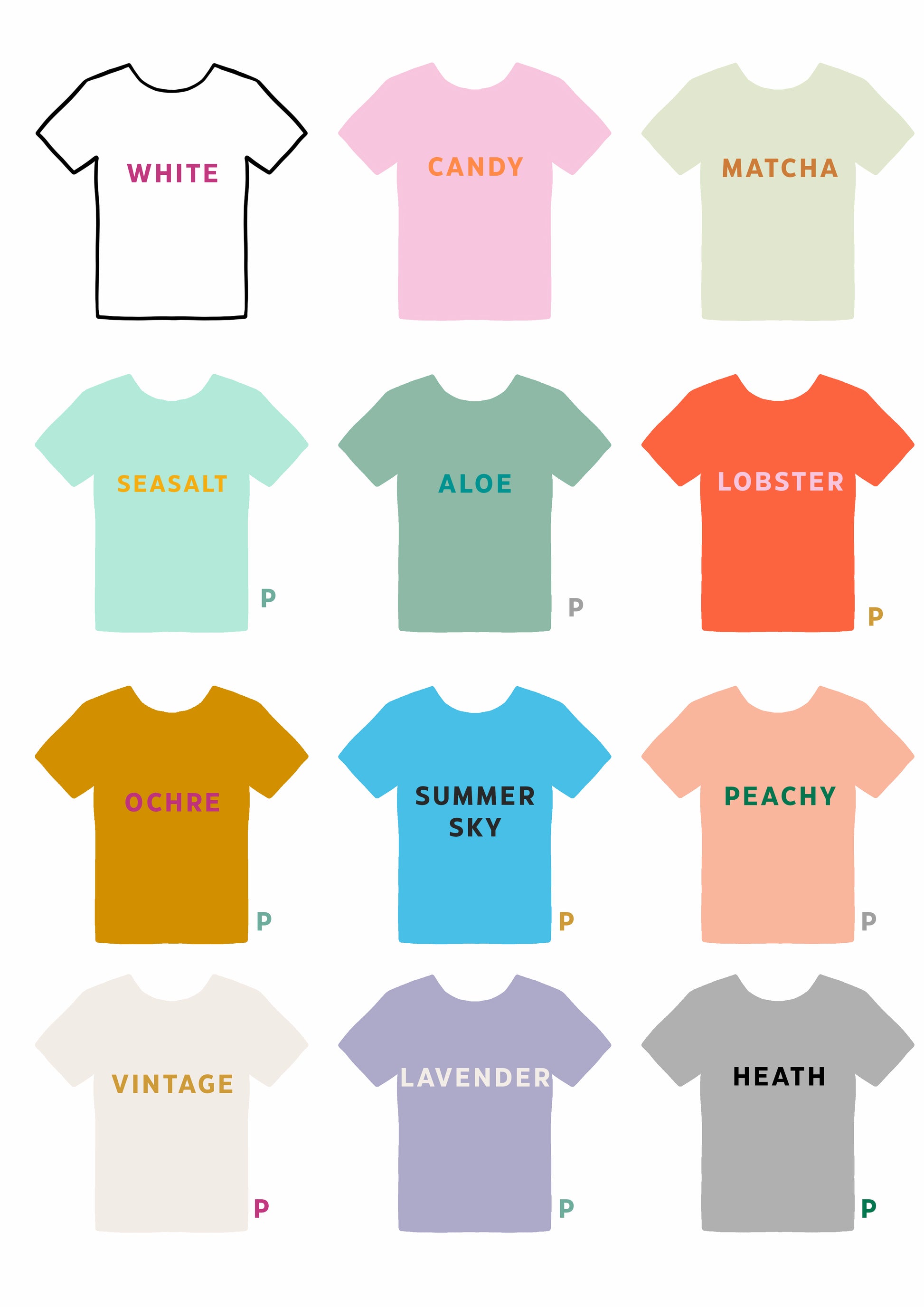 Those labelled with 'P' are slightly thicker and are still loose, but a little less baggy than our standard tees. Perfect if you want a more structured tee!